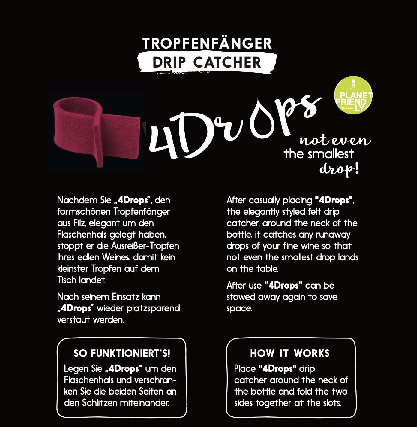 Gemütliches Beisammensein in geselliger Weingenießer Runde bei einem guten Tropfen. Nachdem Sie „4Drops“ elegant um den Flaschenhals gelegt haben, stoppen Sie effektiv die Ausreißer-Tropfen Ihres edlen Weines mit dem formschönen Tropfenfänger aus anschmiegsamem Filz.