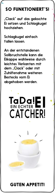 Den Eierschalensollbruchstellenverursacher bringen Sie wie folgt zum Einsatz: Metallkappe auf´s gekochte Ei setzen, die Schlagkugel hochziehen und einfach fallen lassen. An der entstandenen Sollbruchstelle kann die Eikappe wahlweise durch leichtes Verkanten mit dem „Clack“ oder mit Zuhilfenahme weiteren Bestecks vom Ei abgehoben werden.