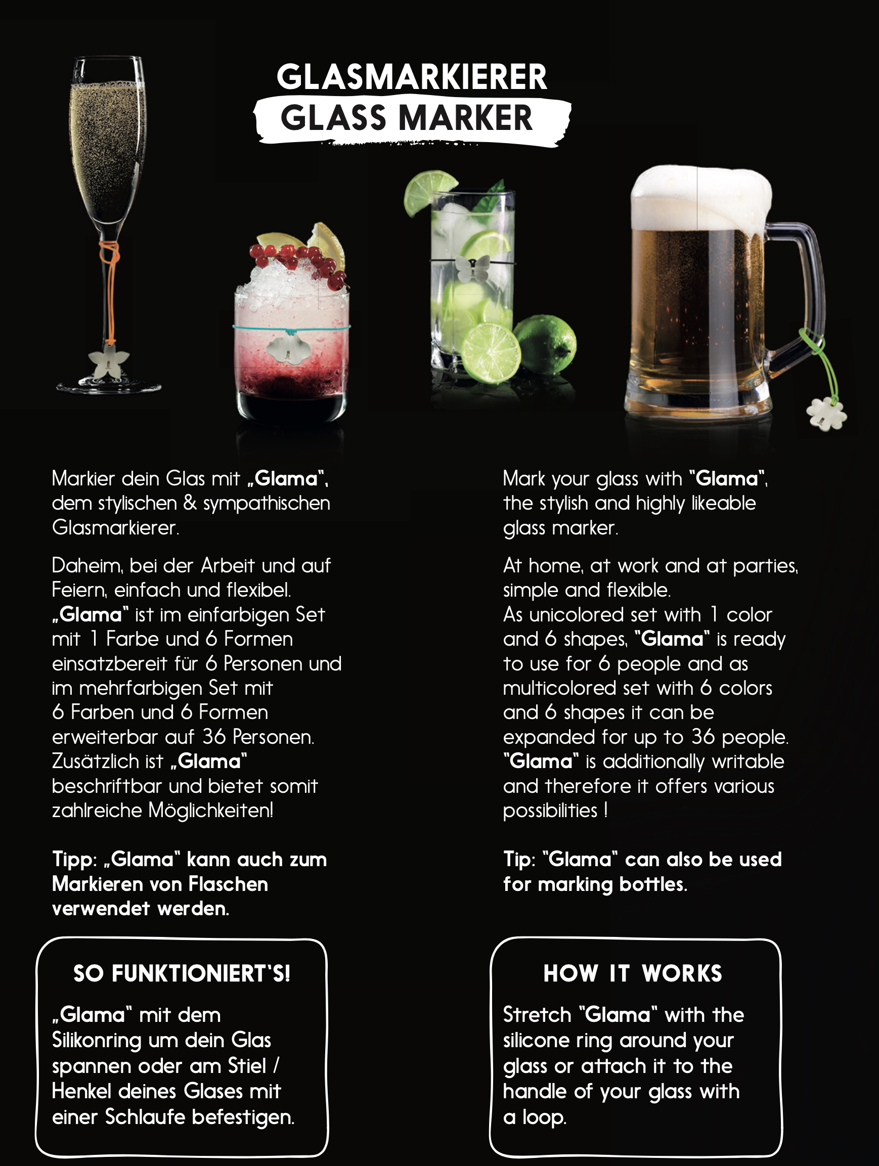 Dank "Glama", dem Glasmarkierer ist damit nun Schluss, denn ab jetzt markiert jeder sein Glas und findet es auch wieder!
