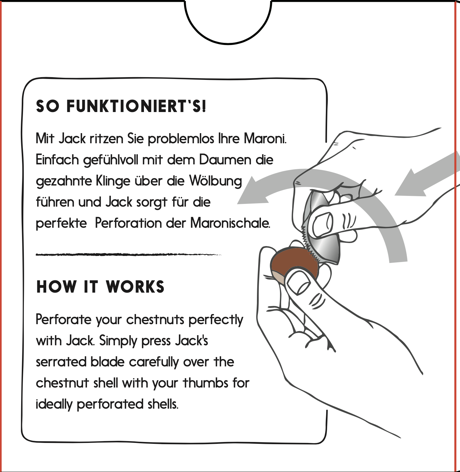 "Jacks" Sägezahnklinge verhindert nämlich, im Gegensatz zu herkömmlichen Messern, ein Abrutschen an der glatten Maronenschale, indem man sie einfach mit dosiertem Druck über die Wölbung der Kastanie führt. Der Kern bleibt unverletzt und die Schale platzt an der perforierten Stelle auf, sobald sie im Ofen, auf heißer Platte oder über offenem Feuer erhitzt wird.