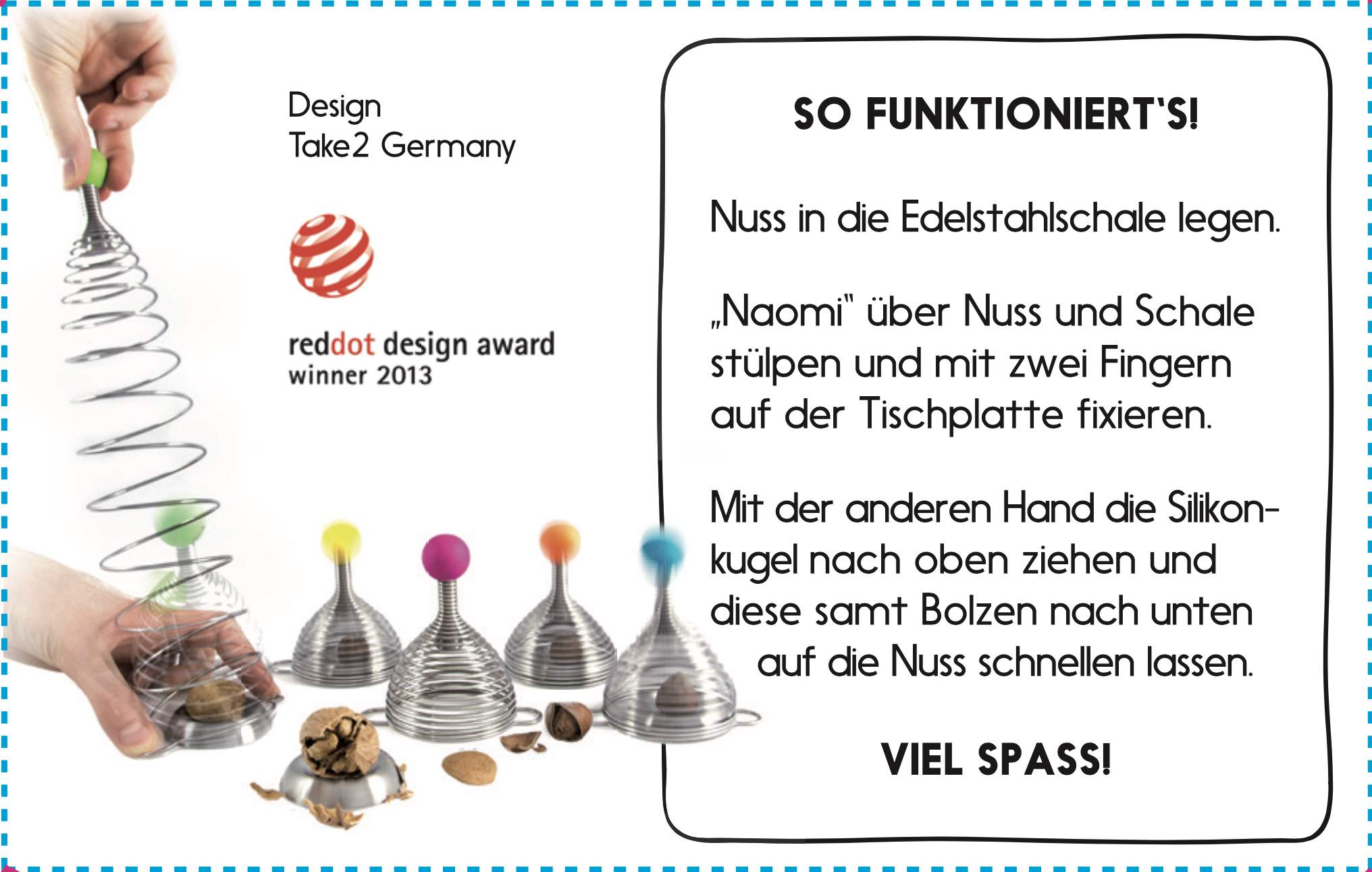 Und eine saubere Sache ist das Nüsseknacken mit "Naomi" auch. Die Spiralfeder schließt sich beim Auftreffen des Bolzens auf die Nussschale und verhindert so ein Herumfliegen der Schale.