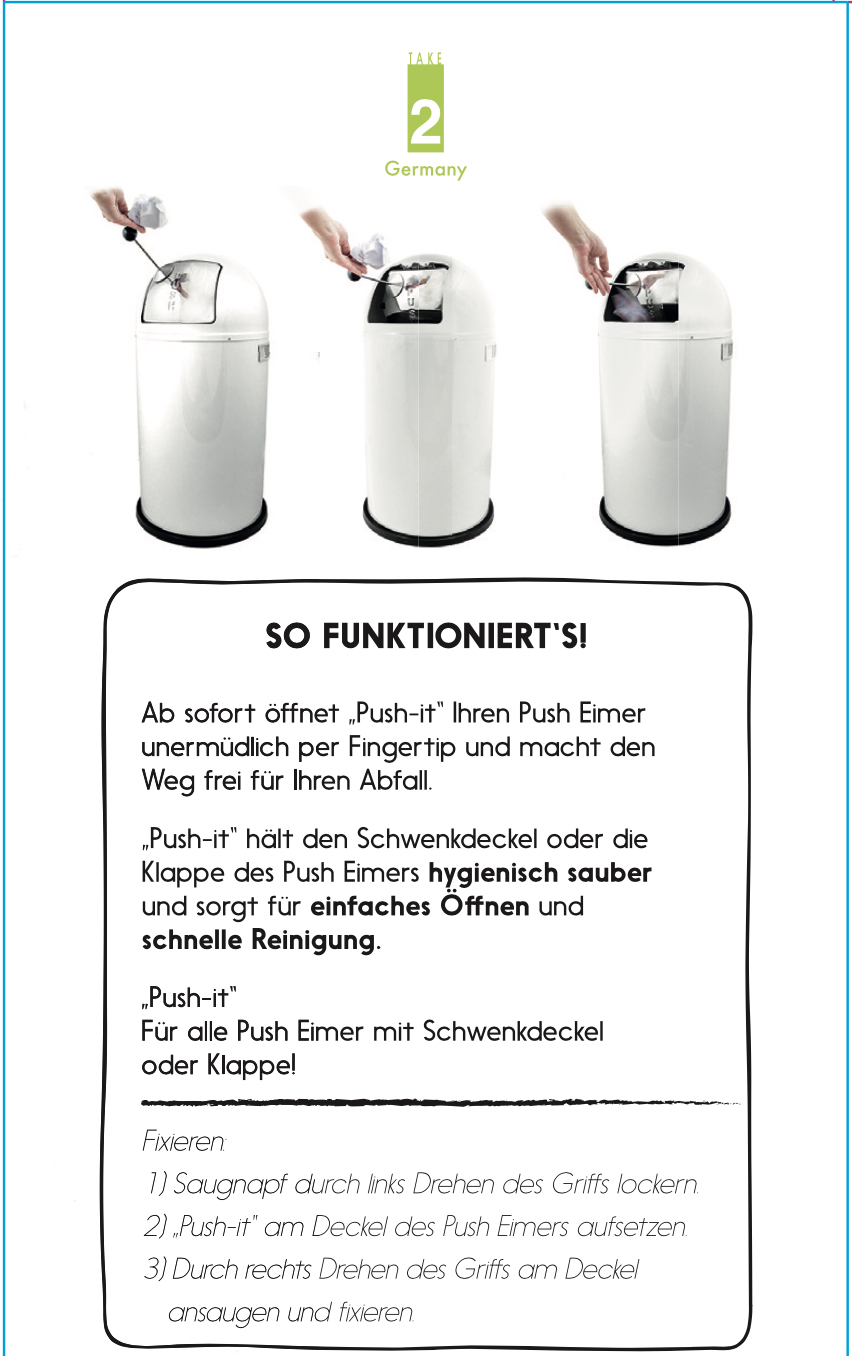 "Push-it" ist die hygienische Lösung für alle Push Eimer mit Schwenk- oder Klappdeckel. Ist "Push-it" erst einmal angehem einfach mit dem Saugnapf am Deckel oder an der Klappe des Push Eimers befestigt, öffnet er ihn unermüdlich per Fingertip und macht den Weg frei für Ihren Abfall.